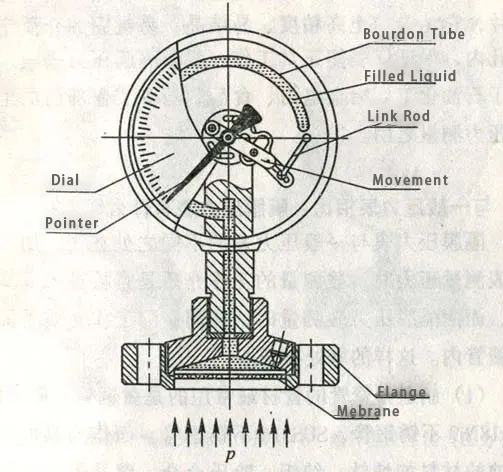 Det elastiske elementet i membrantrykksmåleren er et fjærrør, mens mellomgulvet bare fungerer som en separator. Det elastiske elementet i lavtrykksmembranmåleren er en korrugert membran. Det målte trykket virker på mellomgulvet, noe som får den til å gjennomgå en elastisk deformasjon oppover (eller nedover). Trykkverdien er indikert gjennom koblingsmekanismen sveiset til mellomgulvet.