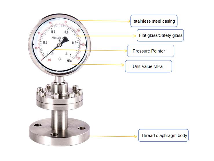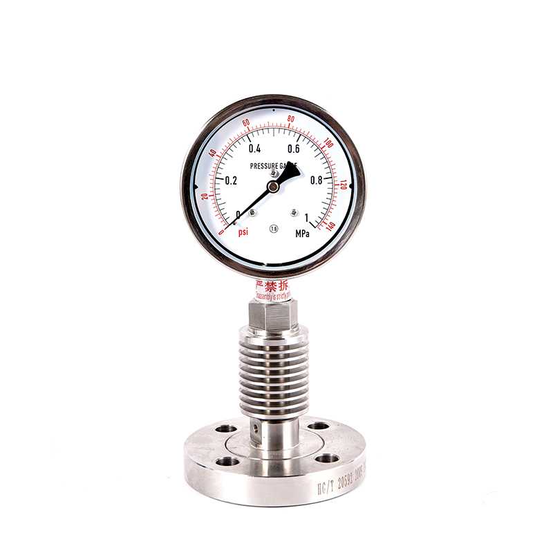 Kjernestrukturen innebærer å installere et membranforseglingssystem (ofte kjent som en "membranklemme" eller "flens") mellom den vanlige trykkmåleren og det målte mediet. Trykket overføres gjennom en tetningsvæske som kalles "fyllingsvæske" (for eksempel silikonolje), slik at etsende, tyktflytende eller høy temperatur matmedier ikke direkte kontakter de sensitive elementene (Bourdon-røret) til trykkmåleren, og dermed beskytter instrumentet og sikrer nøyaktigheten og hygienen til målingen.