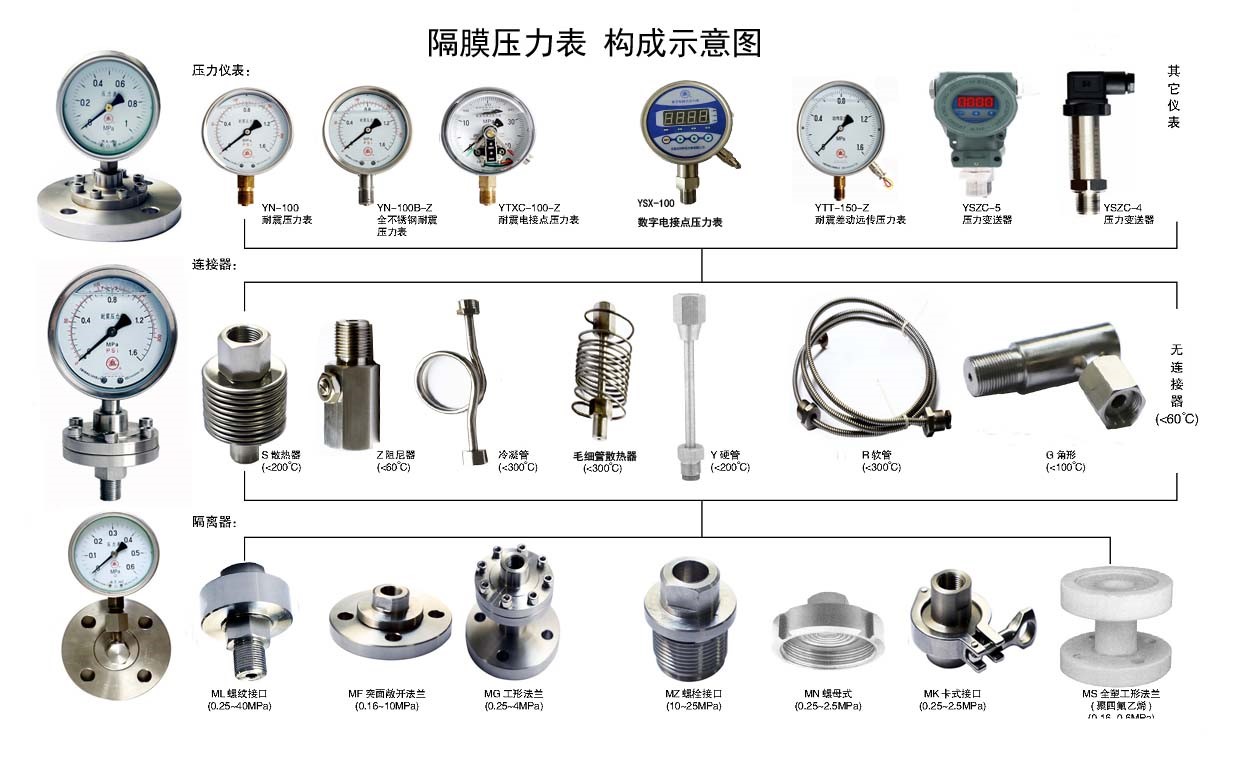 Målerhodet på denne typen instrument kan brukes i en rekke serier: generell trykkmåler, sjokkresistent trykkmåler, en rekke elektriske kontakttrykkmåler, en rekke støtresistent elektrisk kontakttrykkmåler, trykk sender, fjerntrykksmåler, digital trykkmåler, trykkkontroller og så på.
